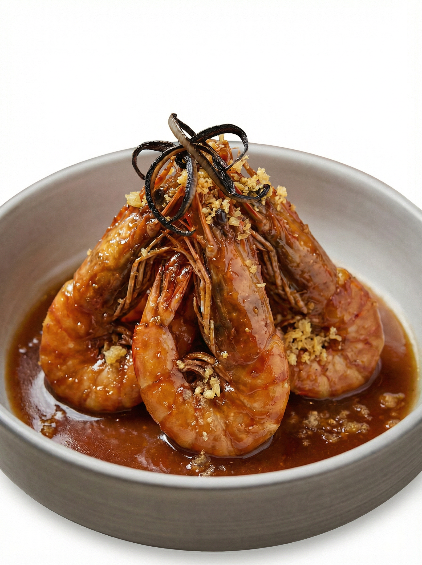 "Jumbo prawns wok-fired in a tangy tamarind reduction with citrus zest and fresh coriander."